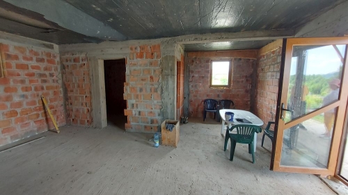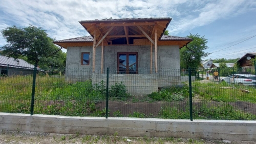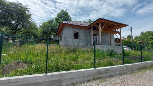 Constructie 2023 (autorizatie valabila pana in anul 2025) ,,la rosu,, pe fundatie de beton armat, cu pereti din zidarie de caramida, placa de beton armat peste parter si cu invelitoare de tigla metalica. Suprafata construita desfasurata: 94 mp. Suprafata utila: 63 mp. Amprenta la sol: 94 mp. Compartimentare: camera de zi (28 mp), 2 dormitoare (11 mp fiecare), bucatarie (6 mp), camara (2,30 mp), baie (5 mp), terasa (14 mp). Finisaje: tamplarie pvc cu geam termopan. Utilitati: apa-canal, gaze si electricitate. Terenul aferent casei este de 300 mp. Frontul stradal al terenului este de 13,70 ml Pret: 75.000 euro. |