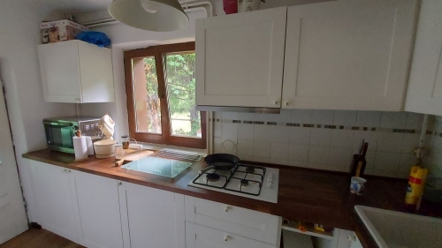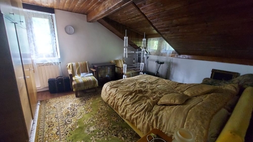 Constructie 1985, pe fundatie de beton armat (pivnita), cu pereti din zidarie de BCA (izolatie termica cu polistiren de 10 cm) si cu invelitoare de tabla. Suprafata construita desfasurata: 131 mp. Suprafata utila: 104 mp. Amprenta la sol: 69 mp. Regim de inaltime: Parter + Etaj mansardat. Compartimentare: Parter - camera de zi, bucatarie + dining, baie, 2 terase. Etaj mansardat - 2 dormitoare, grup sanitar, terasa. Finisaje: gresie, dusumea, faianta, lambriu. Ferestrele sunt realizate din lemn stratificat cu geam termopan, usile interioare si exterioare sunt din lemn. Utilitati: apa, gaze (centrala termica + 3 sobe teracota), electricitate. Anexe: 2 magazii, teren baschet (8m/8m) Terenul aferent casei este de 1.940 mp. Frontul stradal al terenului este 62 ml Pret: 149.000 euro. |